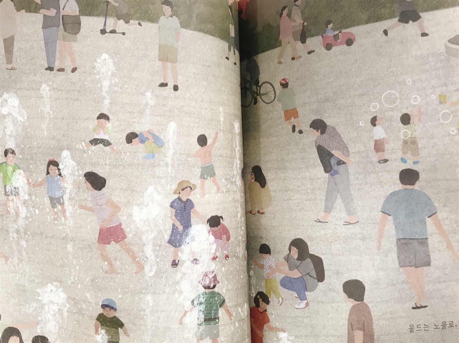 책을 펼치면 표지에서 엿본 봄의 풍경 외에도 여름, 가을, 겨울의 풍경과 사람들의 움직임을 볼 수 있다. 봄이지만 꽃샘추위 때문에 핑크색 코트를 입은 여자, 반팔, 반바지를 입고 분수 속을 뛰노는 아이들, 아름답게 물든 단풍 아래에서 단풍놀이를 즐기는 여인들, 커플, 가족, 그리고 마지막으로 소복하게 쌓인 눈 위에 발자국을 찍는 사람들의 모습에 우리의 일상이 담겨 있다. 지금은 누리지 못하는 일상이지만, 당연하다고 착각했던 우리의 일상들을 그림으로 다시 한 번 볼 수 있어서 소중하다.