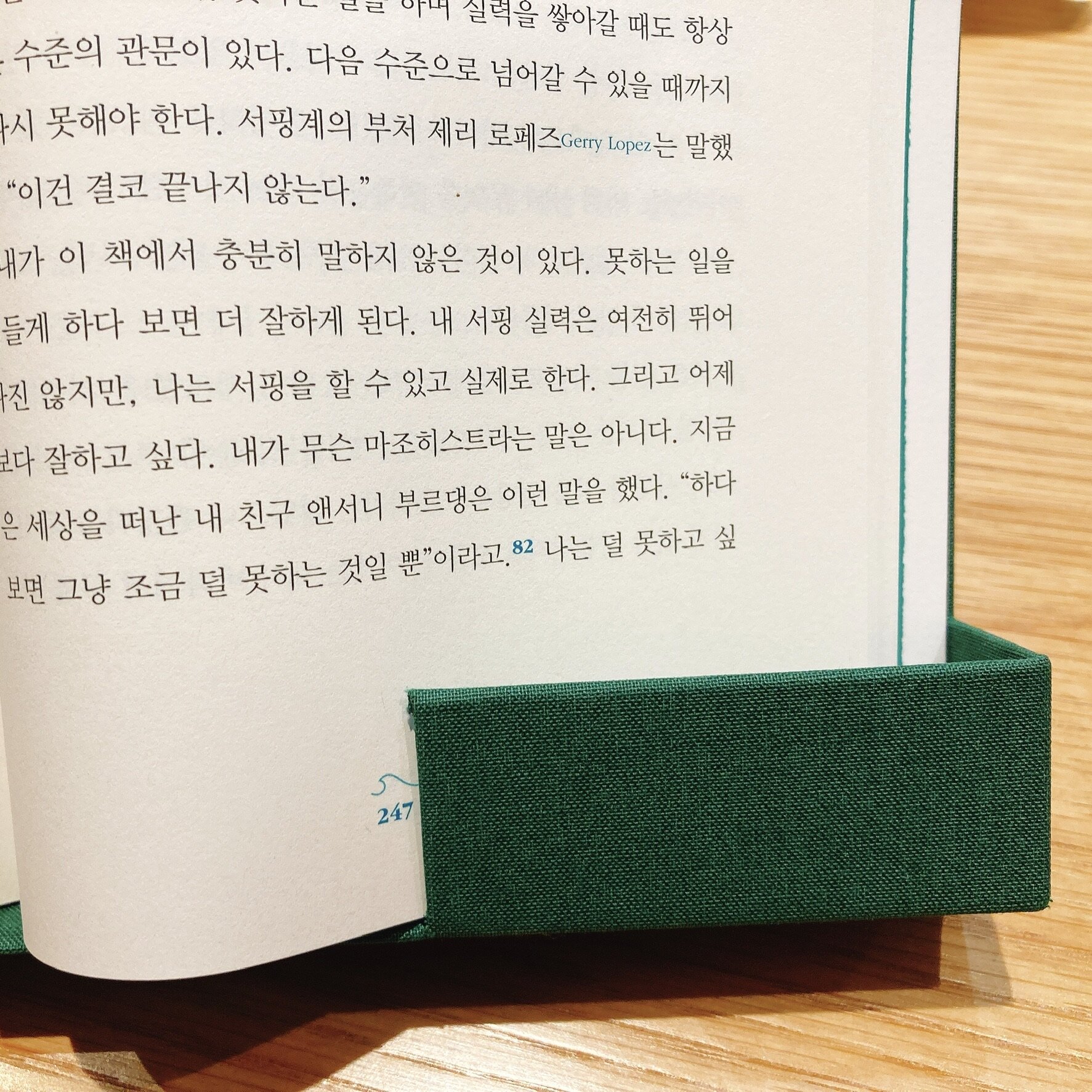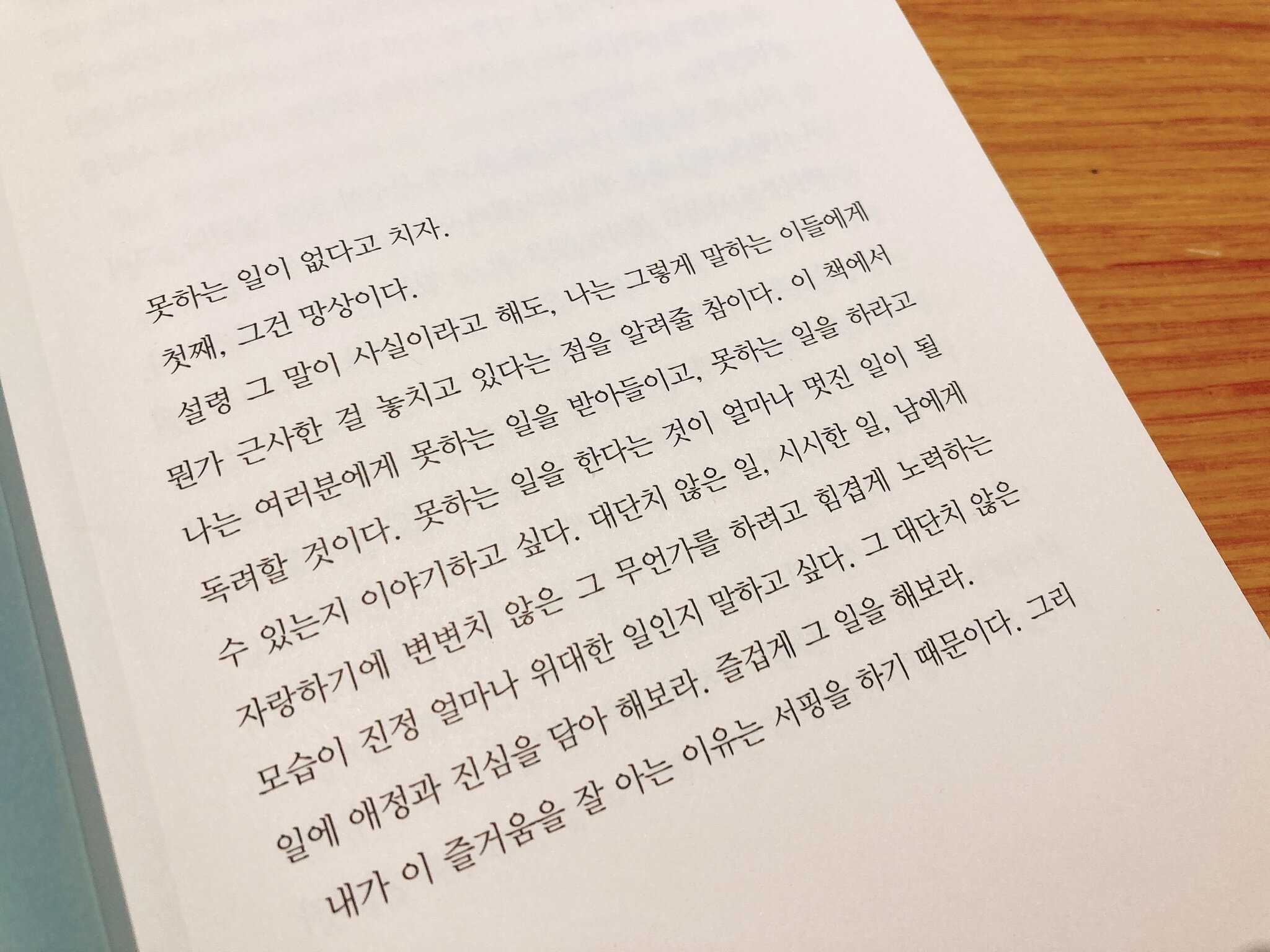 서점에 자기계발서가 끊임없이 쏟아진다. 나는 자기계발서를 내 손으로 직접 골라 읽는 일이 잘 없는데, 내 눈엔 항상 대단한 사람들이 자신이 얼마나 대단한지 보여주는 책처럼 보였기 때문이다. 하지만 이 책은 신기하게도 저자가 자신이 얼마나 못난 사람인지에 대해 쓴 것처럼 보였다. 들어가는 말부터 바로 ‘못하는 일이 없다는 건 망상’이라고 주장한다. 첫장부터 이토록 이례적인 주장들이 가득하니 계속 안 읽을 수가 없었다. 그리고 첫장에 적혀있는 ‘내가 이 즐거움을 잘 아는 이유는 서핑을 하기 때문이다’라는 의심스러운 문장은 내 호기심을 자극했다. 분명 편집자가 쓴 책이라고 했는데 서핑은 무슨 관계일까, 이 사람은 어떻게 자신을 과소평가하면서도 자기계발서를 쓸 수 있었을까에 대한 물음표들이 가득한 채로 책을 읽기 시작했다.