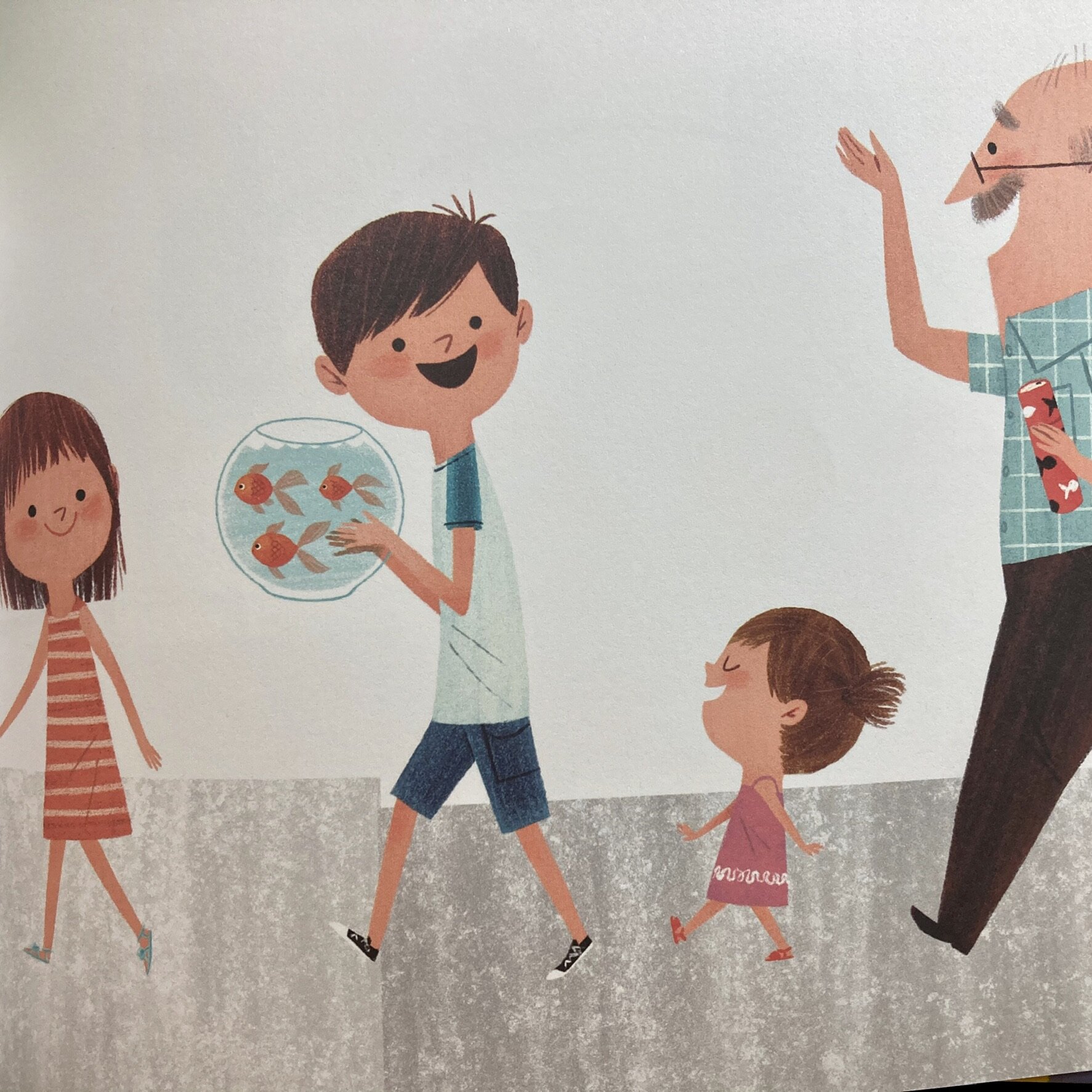 집으로 돌아가는 모습에서도 모두의 얼굴에서 미소를 발견할 수 있었어요. 조잘조잘 금붕어의 여름방학에 대해 이야기하며 집에 가고, 또 내년에도 같은 방학이 있으면 좋겠다고 소망하는 얼굴이 ‘금붕어의 여름방학’이 아이들과 할아버지, 금붕어 모두에게 얼마나 달콤했는지를 보여줍니다. 지금 당장은 이런 행사를 열지 못하겠지만, 나중에 상황이 나아지면 동생을 데리고 장난감 물고기 같은 게 들어간 수영장에서 놀고 싶다는 생각이 머릿속을 떠나지 않더라고요. 사랑스럽고 따뜻한, 즐거운 그림책 <금붕어의 여름방학>이었습니다.