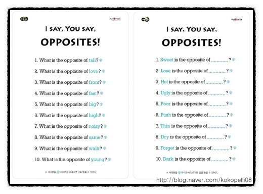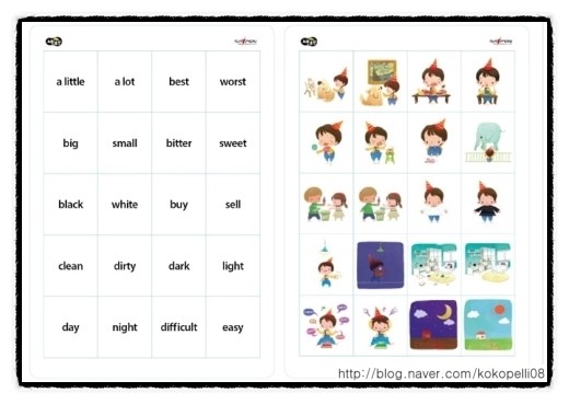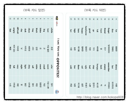 반대말카드는 위에서와 같이 2장이 한쌍을 이뤄 총50쌍(100장)으로 되어 있고요.