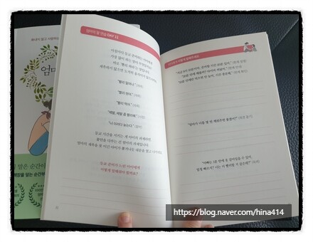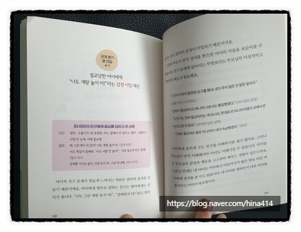 목차별로 상황에 따라 엄마들이 주로 하는 말들이 핑크색 부분에 나옵답니다. 어쩌면 세상 엄마들이 저와 다 똑같은거 있죠? 은근슬쩍 나만 그런게 아니구나 위안도 됩니다. 그래도 고쳐야 겠단 생각이 더 많이 들어요. 아이가 상처를 받았을 수도 있겠구나... 다른 시선으로 보게 되니 마음에 와닿았어요.