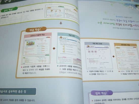 1. 준비학습 2. 개념학습 1(교과서+익힘책 학습, 개념정리. 개념확인문제, 문제풀이학습. 문제해결+탐구활동으로 세부적으로 나눠져 있어요.)