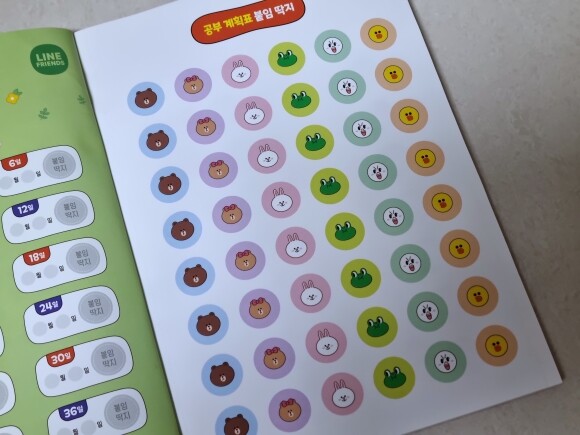 아이들 스스로 공부하고 공부할 날짜와 붙임 딱지를 붙여서 진도를 체크할 수 있으니 귀여운 라인프렌즈 스티커 다 채우려고 열심히 연산 문제 풀 것만 같아요 ♪