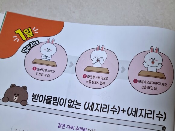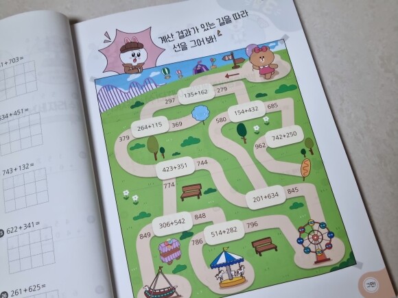 문제만 빼곡하게 나열된 연산 교재가 아닌 귀여운 라인프렌즈 캐릭터들과 말랑 체조도 하며 연산력 강화는 물론이고 재미있게 풀 수 있는 교재라 아이들이 재미있게 공부하는 습관까지 잡아줄 수 있어요