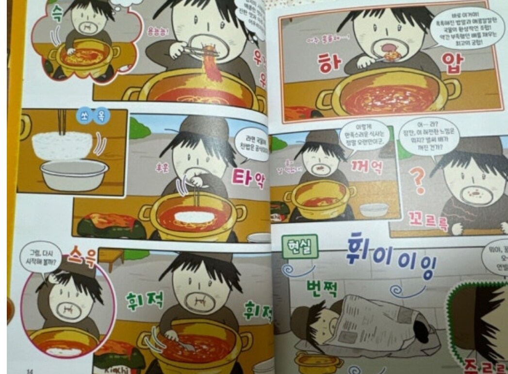 길거리 음식 / 학교 급식 / 집밥 / 외식 순으로 만화가 먹음직스럽게 나오는데 메뉴(!) 끝날 때마다 음식과 관련된 상식이 나오는데 그것이 또 재밌습니다 ㅎ 빨간 떡볶이 먹기 시작한 것이 신당동 마복림 할머니께서 중국집 가셨다가 개업 떡을 짜장면 그릇에 실수로 떨어트린 때부터인 줄 아셨어요? 짜장 소스는 너무 비싸니까 고추장 떡볶이로 탄생시키신 거래요! 새끼 낳은 고래가 미역을 마구 뜯어먹으며 회복하는 것을 보고 산모에게 미역국 먹이기 시작했다는 건요?!? 조금만 알려드렸는데도 흥미진진하시죠?!? 같이 보아요 ㅋ