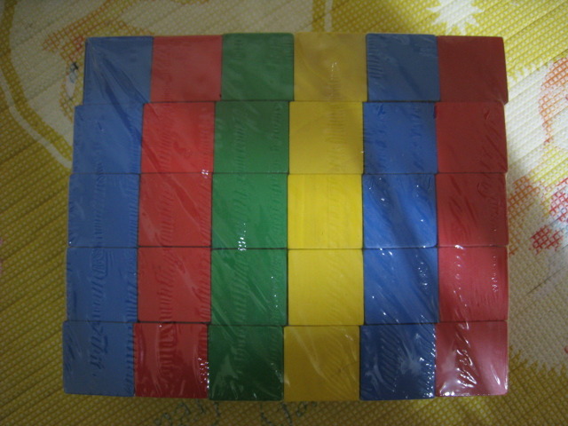 베트남산 원목으로 4색 60개로 한 변에 2.5cm인 정육면체로 구성된 쌓기나무입니다.