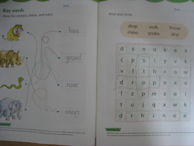 스티커붙이기, 단어와 문장 익히기, 미로, 단어찾기, 보드게임. 미니 북 만들기 등등