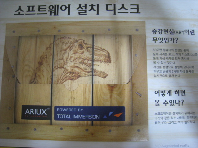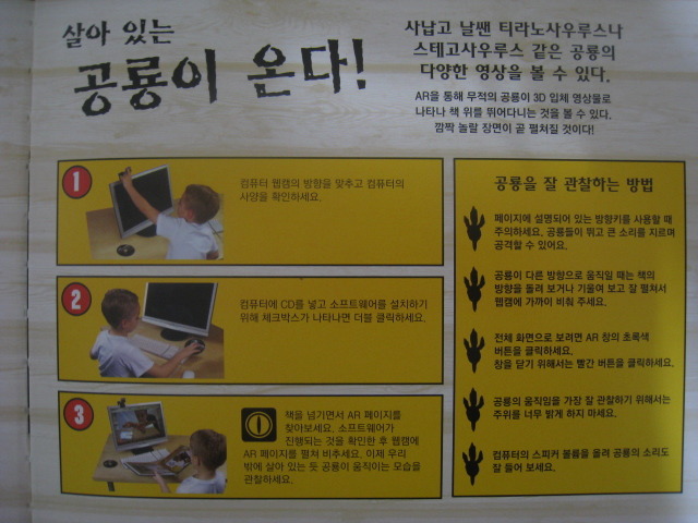 웹캠으로 실제 세계를 보고, 책읠 시디를 통해 가상의 공룡 세계를 겹쳐서 실시간으로