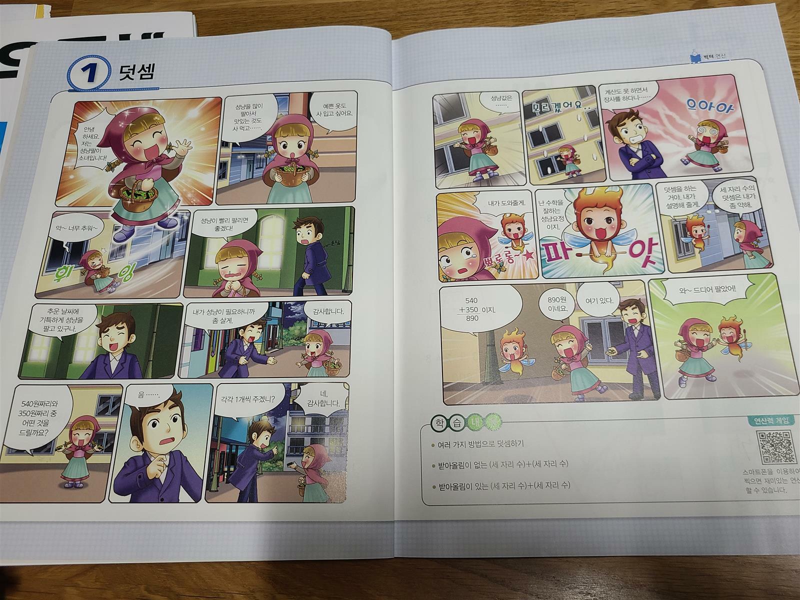 빅터연산은 첫 장에 학습만화가 먼저 나옵니다. 그리고 QR코드 찍으면 나오는 연산력 게임!