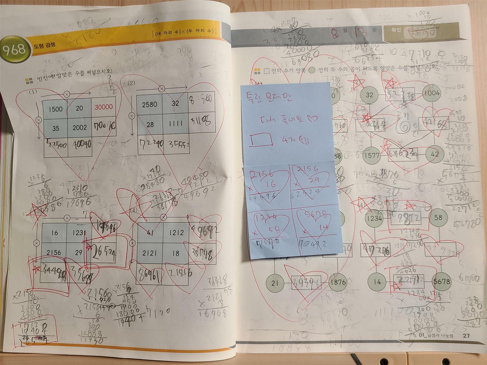 두번이나 틀린 4문제를 포스트잇에 써서 줬어요 그랬더니 맞았네요?