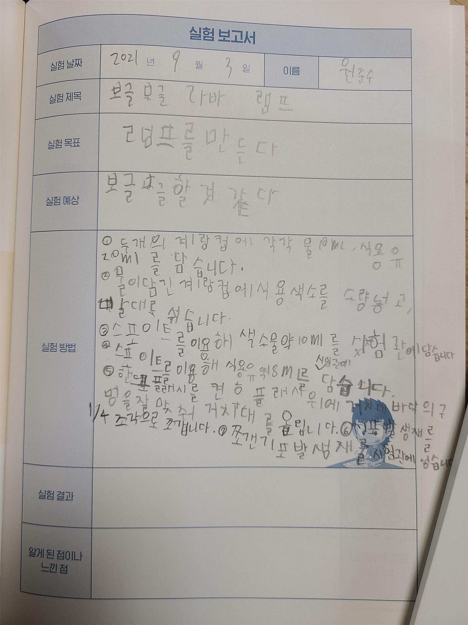 같이주신 실험 보고서 노트 덕분에 보고서 쓰기 싫어하는 아이지만 즐겁게 쓸 수 있었던거 같아요 ㅎ 앞으로 신간이 나올때마다 보고서도 늘어가겠죠?