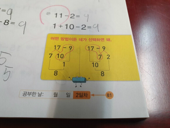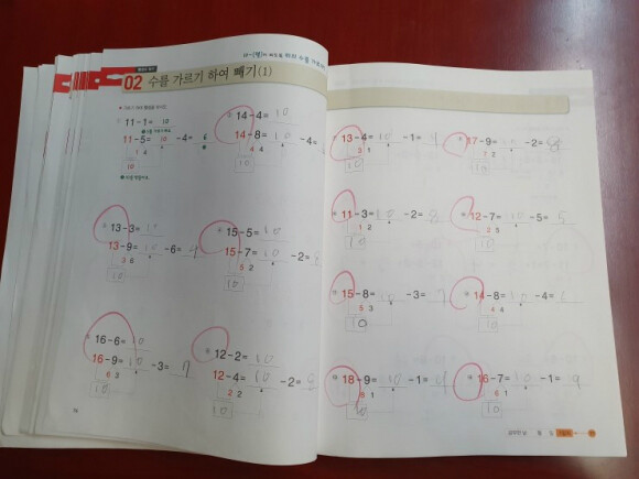 빼서 10이 되도록 앞의 수를 가르는 방법으로 계산을 해 봅니다.