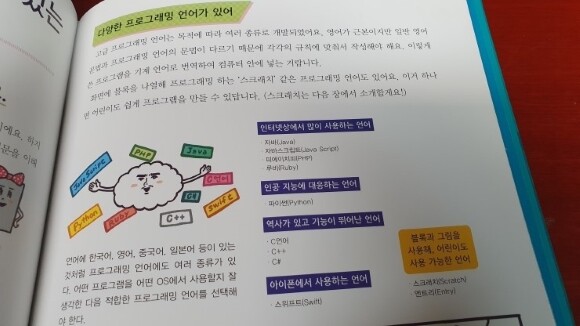 이 책은 스크래치를 설명합니다. 스크래치가 어떤 언어인지 알려주고, 프로그래밍은 어떻게 하는 건지 설명해줘요.