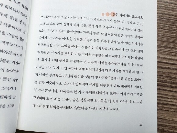 아이와 함께 미술을 감상하는 법, 미술에 접근한느 여섯가지 관점, 미술을 알기쉽게 설명하는 법 등 정리 형식으로 서술되어 있어 가독성은 좋았습니다.