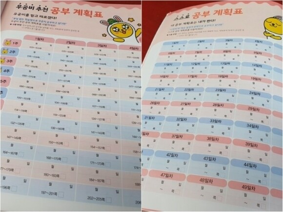 스스로 공부 계획표는 50일차까지 작성가능하며 권장 분량도 기입되어 있지 않아 본인이 계획하고 본인이 컨트롤하며 사용해야해요. 아이마다 실력이 다를테니 스스로 공부 계획표를 통해 자신에게 맞는 일정과 분량을 생각해보고 실천하는 습관을 기르면 자기주도학습을 하는데도 도움이 많이 될 것 같아요.