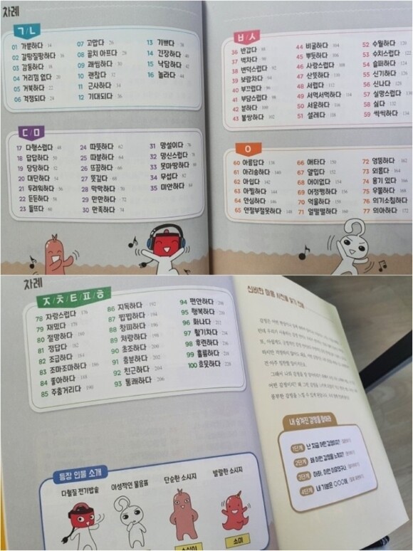 차례를 보면 ㄱ, ㄴ, ㄷ 순으로 100개의 감정을 표현합니다. ㄴ은 두가지 밖에 없고 O으로 시작하는 감정단어는 많네요.