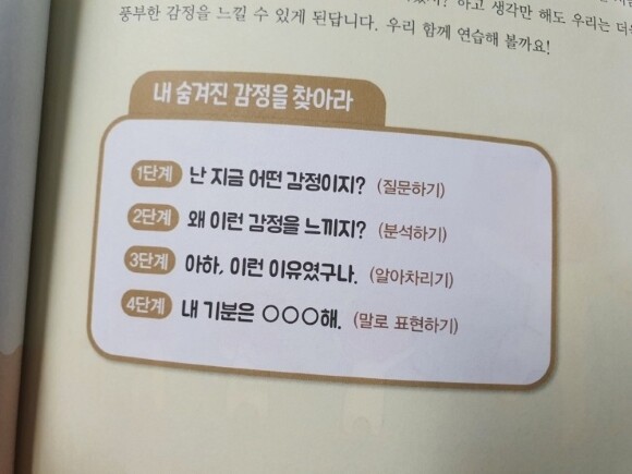 숨겨진 감정을 찾는 방법도 나와있어요. 나에게 감정을 질문하고 그 감정을 분석하고 이유를 알아차린 후 말로 표현합니다.