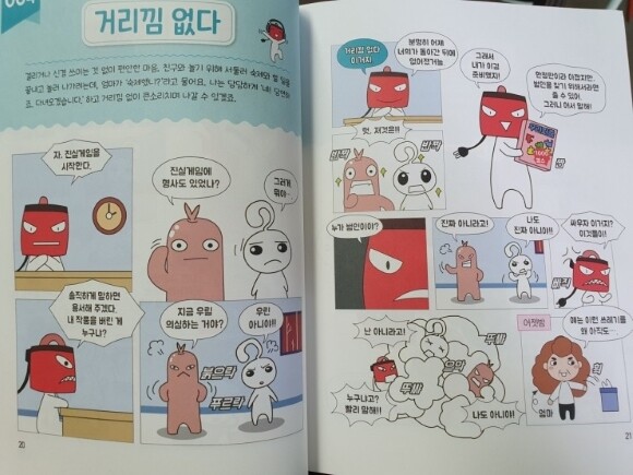 각 페이지마다 2쪽에 걸쳐 감정단어를 설명합니다. 감정단어의 뜻을 설명해주고 글로 이해를 시켜준 후 만화를 통해 더 재미있게 상황을 이해하는 식으로 구성되어 있습니다.