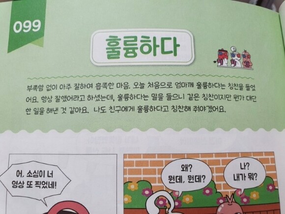 '훌륭하다' 라는 감정의 뜻을 사용하면서 훌륭하다는 칭찬은 뭔가 대단한 일을 해낸 것 같으니 친구에게 훌륭하다고 칭찬해줘야겠다는 설명을 해놓았어요. 이 책은 이런 점도 좋아요. 단순한 상황설명을 넘어서서 다른 사람과의 인간관계에 긍정적인 방향으로 사용할 수 있는 방법을 지도해주거든요. 초등학생이면 충분히 먹혀들 나이이니까요.