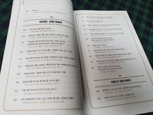 지은이는 이 책을 성찰하는 삶, 지혜로운 삶, 실천하는 삶, 몸과 마음을 다스리는 삶에 대하여 등 총 4부로 나누어 놓았습니다. 총 283가지의 교훈과 지혜를 줍니다.