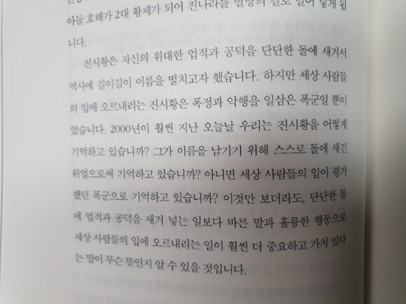 진시황의 이야기를 하면서 '단단한 돌에 업적과 공덕을 새겨 넣는 일보다 바른 말과 훌륭한 행동으로 세상 사람들의 입에 오르내리는 일이 훨씬 더 중요하고 가치있다.'로 결론내며 이렇게 살아야한다는 것을 다시 한 번 일깨워주는 부분이었어요.