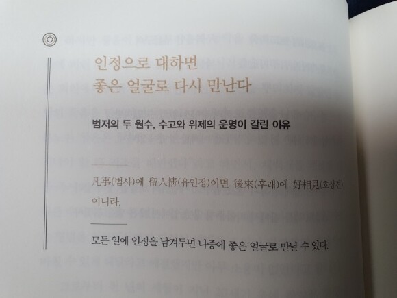 또 모든 일에 인정을 남겨두면 나중에 좋은 얼굴로 만날 수 있다 라는 부분도 심하게 공감했습니다. 인생을 오래 살다보니 앞으로 재회하게 될 인연들이 있을 것만 같습니다. 인정을 남겨뒀다면 더 좋은 재회가 되지 않을까 생각해봅니다. 지금부터라도 잘 새겨 들으려 합니다.