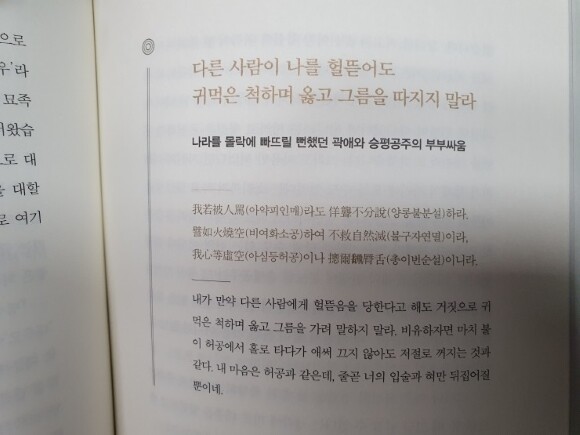 곽애와 승평공주의 부부싸움 이야기를 읽다보니 다른 사람이 나를 헐뜯어도 귀먹은 척 하며 옳고 그름을 따지지 말라는 결론을 읽게 됩니다. 하지만 정말 힘든 일이지요. 요즘은 가만있으면 인정하는 것이 되어버리고 전해지는 말들이 점점 불어나는 시대라고 생각하는데 인문학을 더 공부하고 저를 더 수양해야할 것 같기도 하네요.