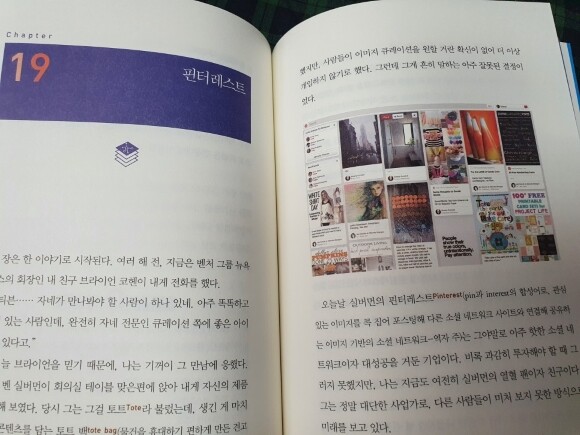 파트3에서는 성공한 큐레이터들을 살펴보고 팁과 비법을 배워봅니다. 모르는 사이트가 많았어요. 이 책이 해외 저자이기 때문에 그 나라에 맞는 예시들이었기 때문일 거에요. 그래서 이 부분은 대충 넘겨서 읽었어요. 그러다 제가 종종 이용하던 핀터레스트가 나왔을 때는 반가웠답니다. 핀터레스트는 취미나 관심사와 관련된 콘텐츠를 콜라주 식으로 모아 핀으로 꽂아놓는 소셜 북마킹 사이트에요. 기업들은 핀보드를 이용하여 큐레이트하고 있었습니다. 아~ 이렇게 기업들이 큐레이트하고 있었던 것이구나. 잘 아는 사이트에 대한 예시를 보니 이해가 되었어요.
