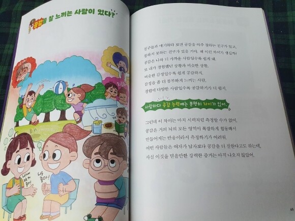 뇌, 감정, 호르몬에 대한 설명 다음으로는 공감에 대한 이야기를 합니다. 사람마다 똑같은 상황에 감정이 다를 수 있고 공감 능력에도 차이가 있다는 것을 배워요. 공감능력의 차이는 뇌의 모든 영역이 복잡하게 협동해서 만들어지는 반응이라 측정은 어렵다고 하는군요.