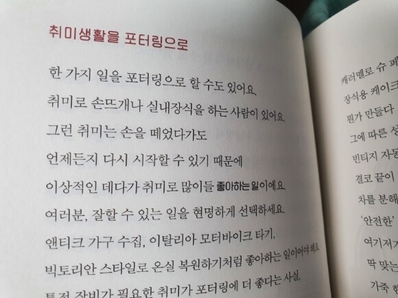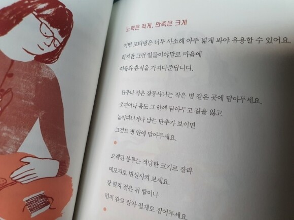 저는 언젠가부터 저의 시간에 쫓겨 늘 바쁜 사람이었어요. 주부가 왜 바쁜거지? 오늘 한 것도 없는데 왜 이리 바쁘지? 하면서도 마음의 여유가 없어 다른 사람을 만나는 것도 시간이 아까웠고, 만나더라도 공감할 수가 없었어요. 그래서 깊은 관계로도 갈 수 없었고, 어쩌다 감정적으로 부딪히기라도 하면 그 관계까지 온 그 과정도 다 지우고 싶을 만큼 스트레스가 오더군요.