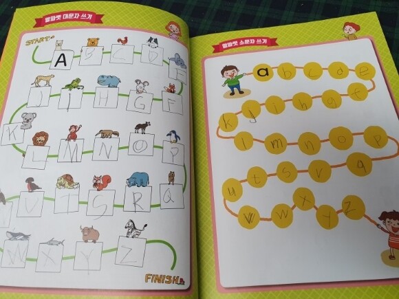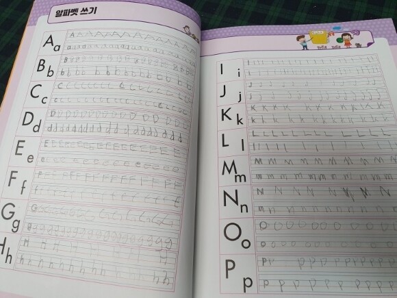 알파벳 쓰기부터 시작합니다. 파닉스 떼고 영어 배운지도 좀 되었기에 알파벳은 혼자 써보라고 했더니 한참있다가 이 책 너무 힘들다고 말하더군요. 알파벳 쓰기가 왜 어렵냐 물으니 칸 너비 조절을 못하는 나이라 한 글자를 10번 넘게 써야하니 힘들다고.. 약하게 세로줄을 그어 칸을 표시해줄 걸 그랬나요? 이렇게 쓰면 알파벳 모르는 아이도 외워지겠네요.