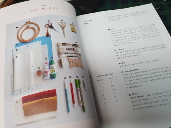 프랑스자수는 서양자수에요. 매듭이 서양매듭, 동양매듭으로 나뉘듯 비슷한듯 아닌듯하게 구별되는 부분이 있을 거에요. 프랑스자수 기초라고 하니 잘 읽어보았답니다. 수틀은 생각보다 작은 것으로 사용해서 이 책을 만드셨어요. 프랑스자수용바늘의 특징도 알게 되었습니다. 원단먹지라는 것도 있네요. 아주 유용할 것 같아요. 초보가 읽어보기엔 신세계입니다.