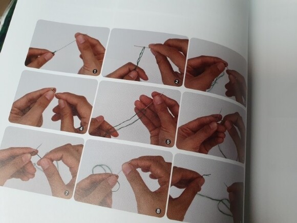 수틀에 원단 끼우기, 보빈에 실감기, 바늘에 실끼우고 매듭짓기, 원단에 도안 옮기기, 완성 후 매듭 짓기 등 순서대로 세세히 가르쳐주기에 어떤 초보자들이라도 이해할 수 있을 것 같아요. 매듭짓는 방법은 알고 있어서 책의 사진을 보니 순차적으소 잘 정리되어 방법을 알려주고 있었습니다.