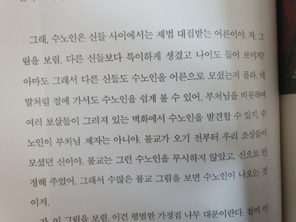 수노인은 이 책으로 처음 만나봤어요. 수노인은 불교가 오기 전부터 모셨던 신이고 불교는 이런 수노인을 무시하지 않고 신으로 인정하여 부처님을 비롯한 보살들이 그려져있는 벽화에 등장하곤 한다는데 몰라서 그랬던 건지 저는 한 번도 본 적이 없는 것만 같아요. 특이한 외모의 수노인을 이제 알게 되었으니 알고 보는 눈으로는 찾을 수 있을지도 모르겠다는 기대감도 생깁니다.