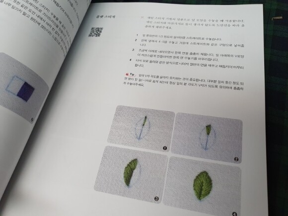 플랫스티치는 새틴스티치기법의 일종으로 잎모양 수놓을 때 사용한다고 해요. 방법도 친절하게 알려주니 읽을 줄만 안다면 혼자서 하는데 문제없을 듯해요. 팁도 알려주니 초보입장에서는 이 책의 친절함이 좋습니다.