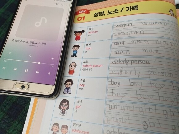 책 뒷면에 원어민 발음이 든 CD가 있지만 집에 CD 플레이어가 없는 관계로 반석출판사 홈페이지 자료실에서 음원을 다운로드 받아 폰에 저장했어요. 그리고 발음을 들으면서 글자를 씁니다. 눈으로 보고, 귀로 듣고, 손으로 쓰면 더 확실히 외워지겠지요.
