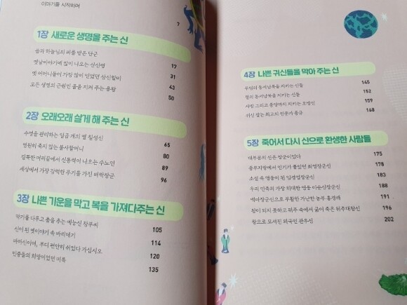신은 생명을 주고 장수하게 해주며 복을 자져다 주고 나쁜 귀신도 막는 여러 종류가 있었네요. 아이들이 목차를 보더니 들어본 신이 많고 처음 들어본 신은 궁금하다며 관심을 가져요.
