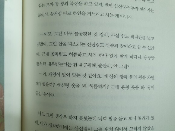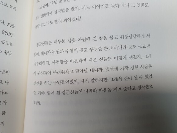 이 책은 재미있는 주제들도 종종 나와요. 산의 왕인 산신령은 옷이 허름하고 물의 왕인 용왕의 옷은 화려한 것에 대한 궁금증. 생각해보니 그러네요. 이 책은 신의 이야기를 들려줄 뿐 아니라 재미를 느낄 수 있는 주제들이 던져주기에 생각하며 읽느라 더 재미있었습니다.