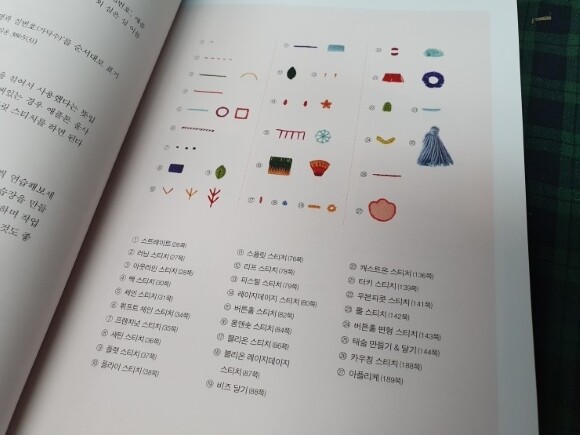이 책을 통해 배우게 될 스티치들을 다 모아놨어요. 저는 9번 플래스티치를 해보고 싶습니다. 어려워보이진 않아요. 자수이미지가 너무 예뻐서 빨리 따라하고픈 의욕이 생기네요.