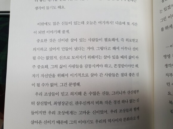 신은 인간이 필요해서, 위로받고 의지하고 싶어서 만들어 냈다는 것. 우리 조상이 믿고 의지해 온 수많은 신들도 우리의 역사와 문화라는 것.