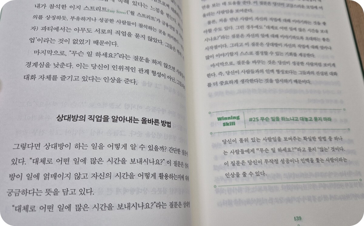 그 밖에도, '아주 작은 대화의 기술'에서는 우리들이 일상생활에서 자주 접하게 되는 여러 상황 속에서 현명하면서도 나의 의도대로 자연스럽게 대화를 이끌어나갈 수 있는 대화 전략들에 대해서도 알려주고 있어서 큰 도움이 되었는데요, 대화를 통해서 상대방의 정보를 알아내고 좋은 인상을 남길 수도 있는 노하우들이 담겨 있어서 꽤나 흥미롭게 읽어나갈 수가 있었어요.