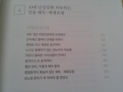 책을 통해 많은 사람들이 만성질환에 걸려 고생하고 있음에 놀랐다. 저자는 비만과 당뇨병, 고혈압과 뇌졸중, 고지혈증과 심장병, 만성염증질환과 자가면역질환, 양성종양과 악성종양을 10대 질환으로규정하고 이를 위한 맞춤 해독과 재생 요법을 소개하고 있는데, 요즘 늘어난 체중때문에 고민이 되기 시작하다보니 '비만과 당뇨병'에 대한 부분을 읽을 때는 반복해서 읽었다. 모든 병의 원인은 비만이기에 제대로 먹고 제대로 움직여야 하는데 가장 기본적인 방법을 잊어버리고 있었음을 확인하게 되었다. 서른 다섯의 나이에 당뇨병 환자가 된 사람의 이야기는 젊은 나이에도 당뇨병에 걸릴 수 있고, 이를 고치기 위해 자연치유법을 따른 결과 짧은 시간안에 고칠 수 있었음을 통해 자연치유법이 얼마나 효과적인 치료방법인가를 알게 되었다.