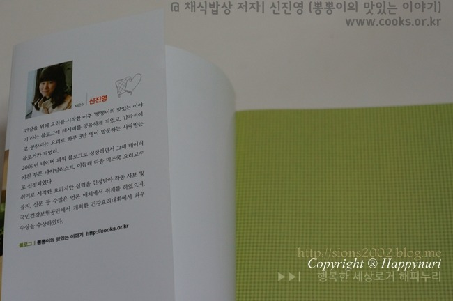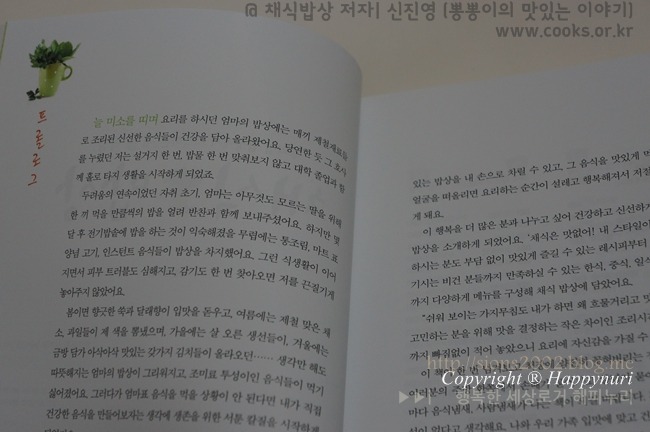 블로그를 하다보면, 수많은 인연을 온라인에서 마주하게 됩니다. 맘에서 맘으로 호흡하기도 하고, 때론 한치의 물러섬없는 갈등도 빚게 됩니다. 하지만 결론적으로 블로그는 무미건조한 일상을 맛깔있게 요리하는 것과 같습니다. 얼마전 네이버 요리분야 파워블로거 뽕뽕이 님의 블로그를 통해 『채식밥상』을 접할 수 있었습니다. 블로그속에 자신의 관심사를 투영하고, 많은 이들의 공감을 이끌어내고 책으로 지혜를 나눠주는 일 얼마나 멋진가요?