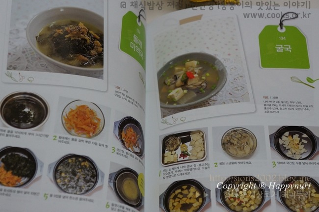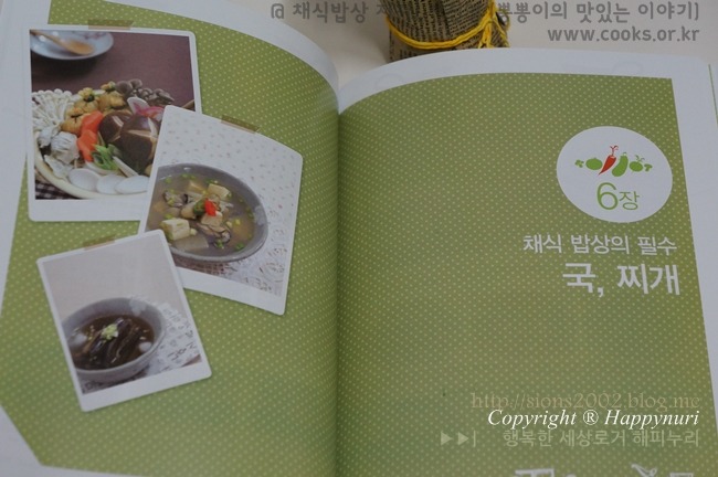 한국인의 밥상중 필수라는 국, 찌개... 특히 따뜻한 국물이 그리운 계절 겨울엔 제대로 끓여낸 국, 찌개면 반찬이 따로 필요없을 정도입니다. 『채식밥상』에 담긴 국, 찌개는 지면할여상의 이유 때문인지 다소 아쉽습니다. 동태찌개가 없고, 육계장이 없으니깐요!ㅎㅎ 채식이 의미하는 포괄적인 저염식 때문인지, 책속에 담긴 음식들의 맛은 순해 보입니다. 매혹적인 빨간 색채나 소금기 흥근하게 푹 빠진 하얀 색채는 없습니다.