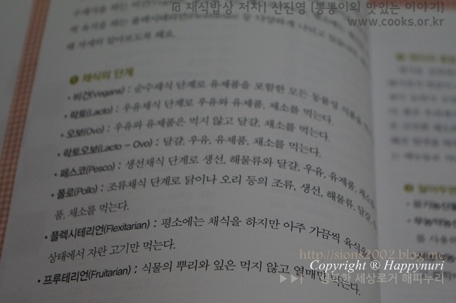 본격적인 『채식밥상』의 테마를 시작하기전 채식주의 ( Vegetarian )에 관한 소개를 다루고 있어요. 개인적으로 육식을 즐겨하는 편은 아니지만, 세계채식연맹에서 정의하는 " 소, 돼지 등 육지의 동물은 물론, 생선도 먹지 않고 우유나 달걀은 개인적으로 먹을 수도 있고 안 먹을 수도 있다. " 의 비건 ( Vegans )는 부담스러운 수준이네요. 머리를 안깎았을뿐 도승지의 수행자를 연상하게 합니다.