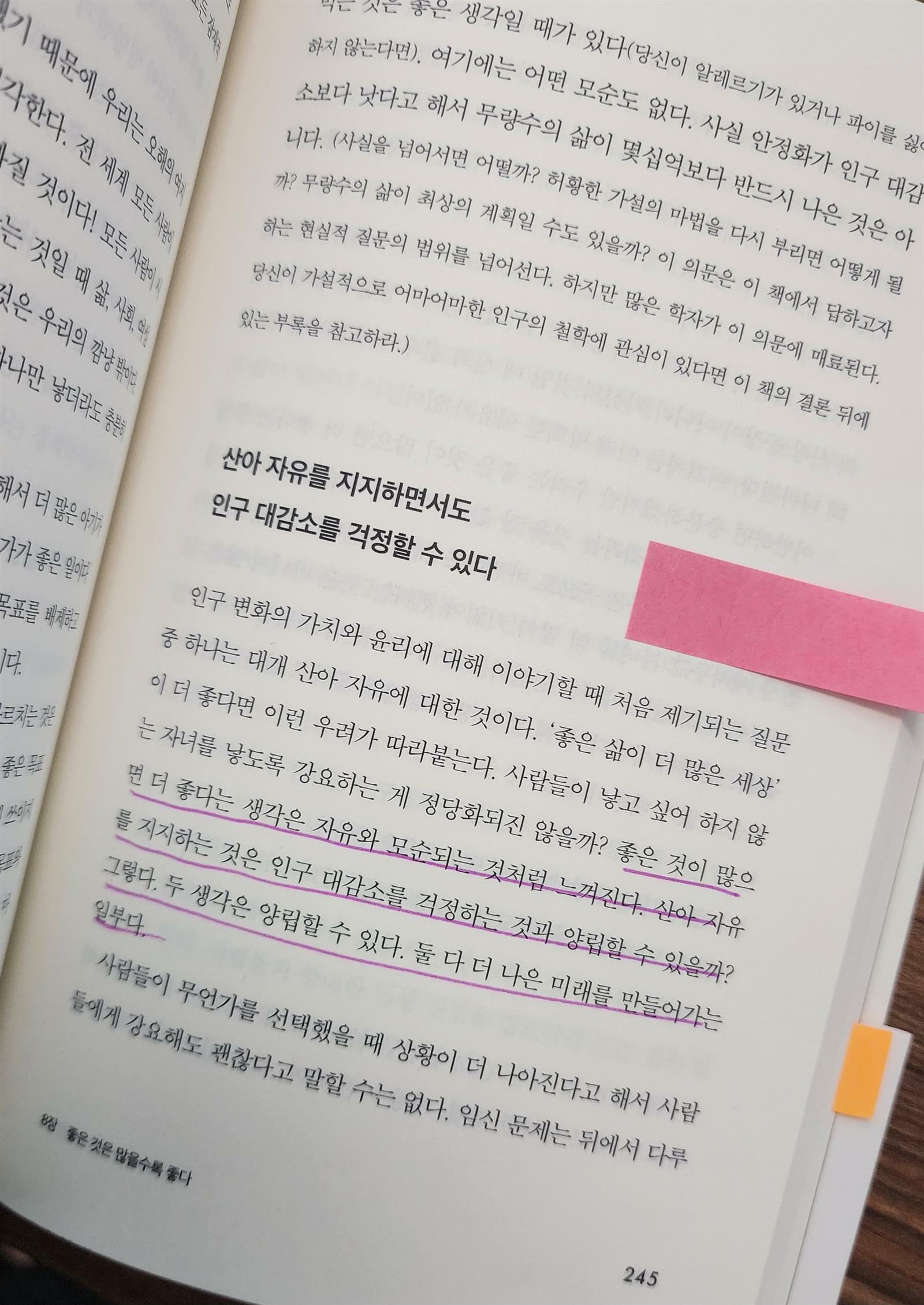 <"좋은 것이 많으면 더 좋다는 생각은 자유와 모순되는 것처럼 느껴진다. 산아 자유를 지지하는 것은 인구 대감소를 걱정하는 것과 양립할 수 있을까? 그렇다." 245>