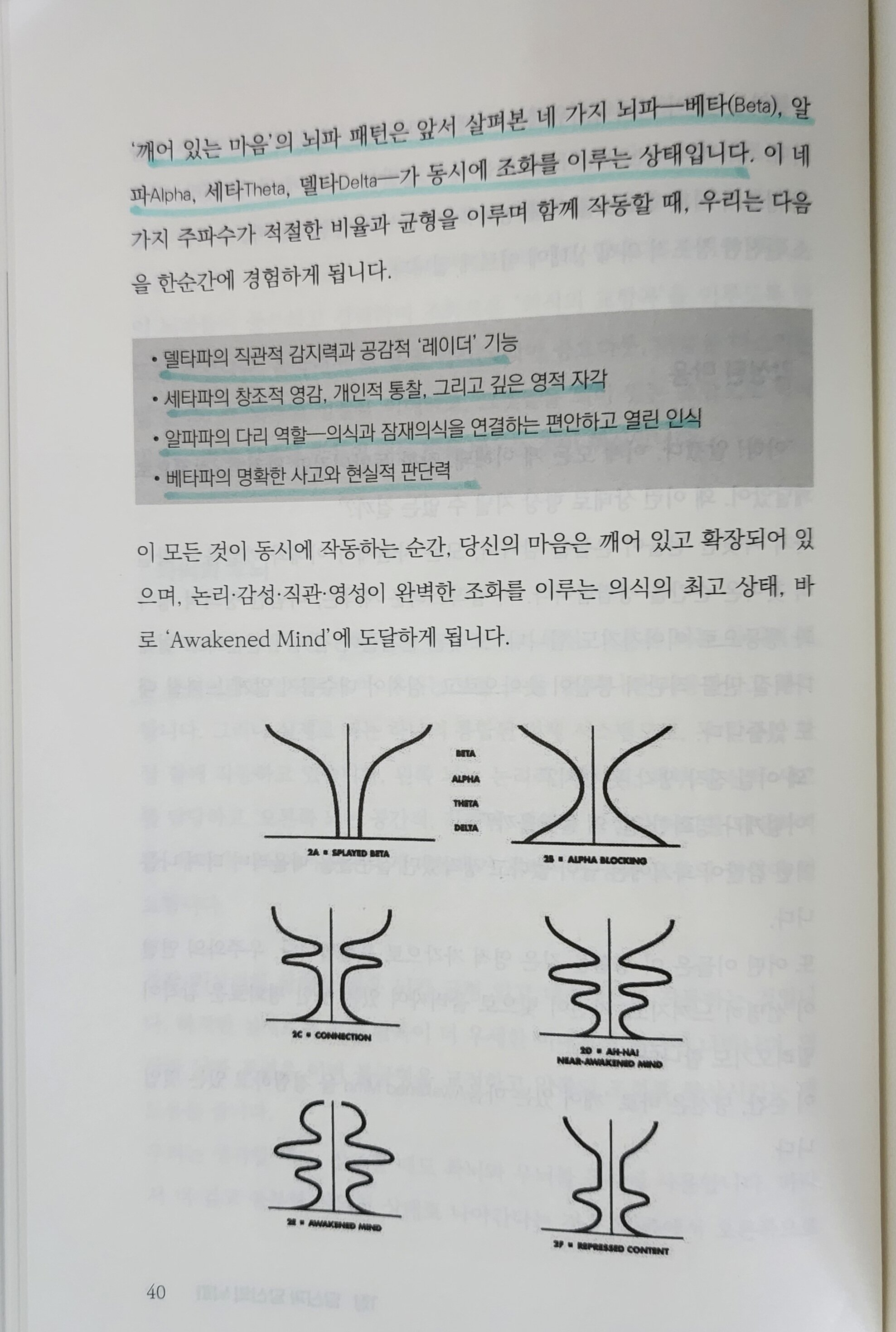 저자는 오랫동안 신경치료와 뇌파 연구를 진행해 온 전문가로, 인간의 정신 활동을 베타·알파·세타·델타라는 네 가지 뇌파 패턴을 중심으로 설명한다. 일반적으로 우리는 깨어 있는 동안 베타파 중심의 상태에 머무르지만, 깊은 집중과 창의적 사고가 발휘되는 순간에는 여러 뇌파가 조화를 이루는 특별한 상태가 형성된다고 한다. 저자는 이를 ‘깨어 있는 마음(Awakened Mind)’이라 부르며, 이 상태에서 인간은 통찰과 직관, 창의성이 자연스럽게 흐르는 경험을 하게 된다고 강조한다.