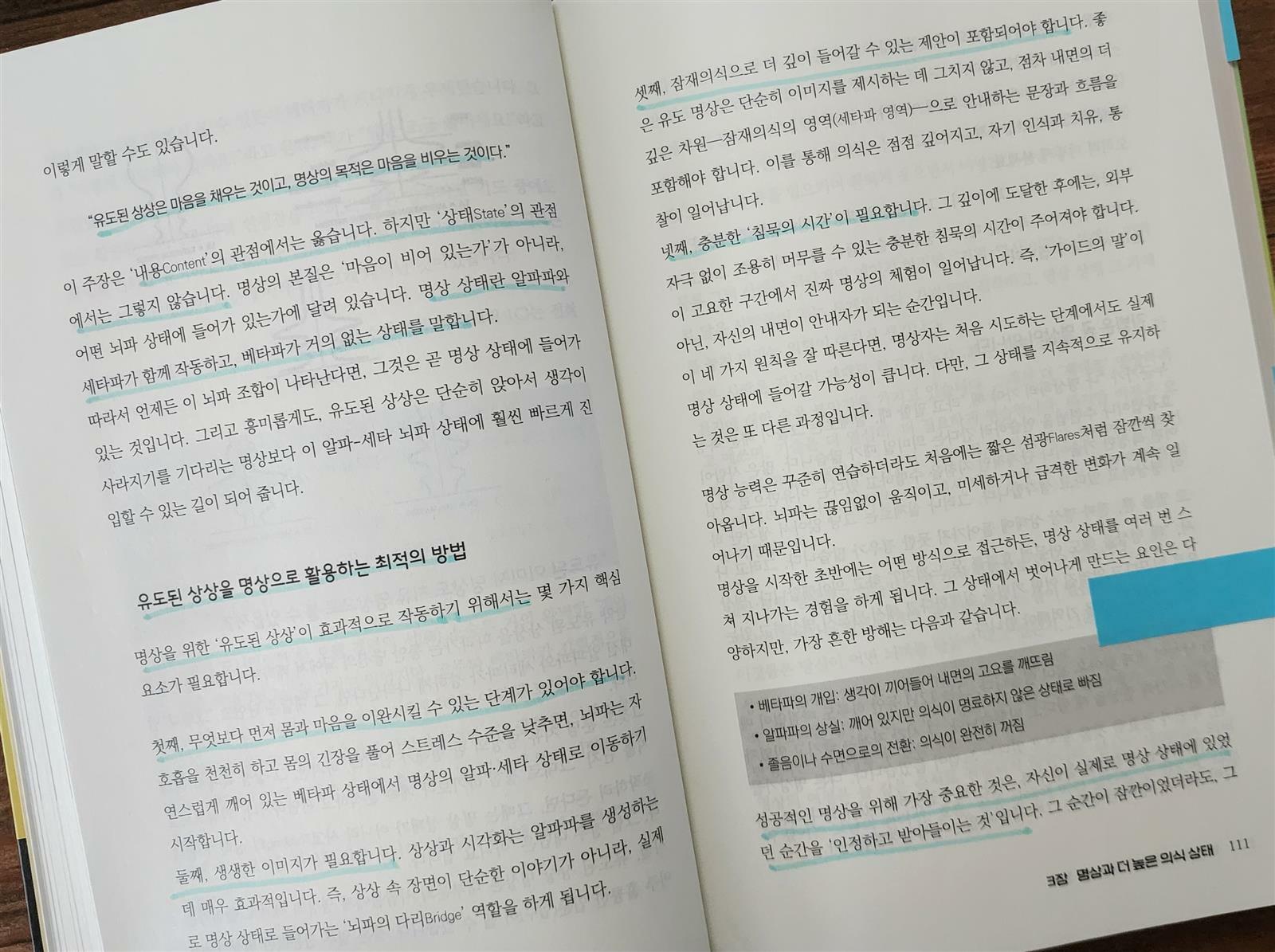 특히 인상적인 부분은 명상과 의식 훈련에 대한 설명이다. 저자는 명상을 단순히 마음을 비우는 행위로 보지 않는다. 오히려 명상은 의식과 잠재의식, 무의식을 연결하며 뇌의 균형을 회복하는 과정이라고 설명한다. 이 책은 독자가 명상을 보다 쉽게 이해하고 자신에게 맞는 방법을 찾을 수 있도록 다양한 사례와 구체적인 훈련 방법을 제시한다. 또한 실제로 따라 해 볼 수 있도록 과학적 근거와 연구 사례를 바탕으로 친절하게 안내하고 있다는 점도 큰 장점이다. 덕분에 독자는 단순히 이론을 읽는 데 그치지 않고, 자신의 마음 상태를 직접 관찰하고 조율하는 경험까지 시도해 볼 수 있다.