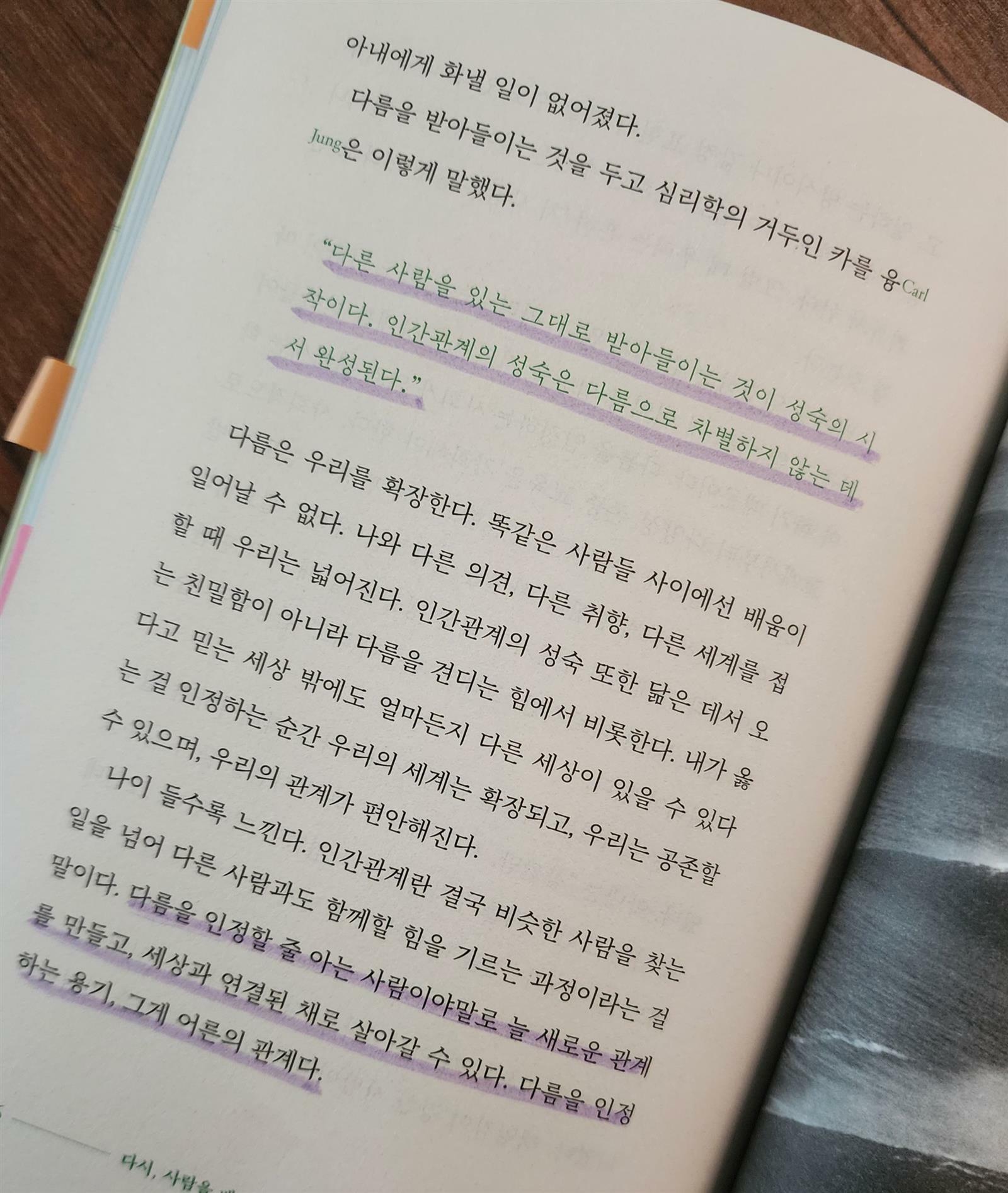 <"다른 사람을 있는 그대로 받아들이는 것이 성숙의 시작이다. 인간관계의 성숙은 다름으로 차별하지 않는 데서 완성된다." -카를 융 - 책 276쪽>