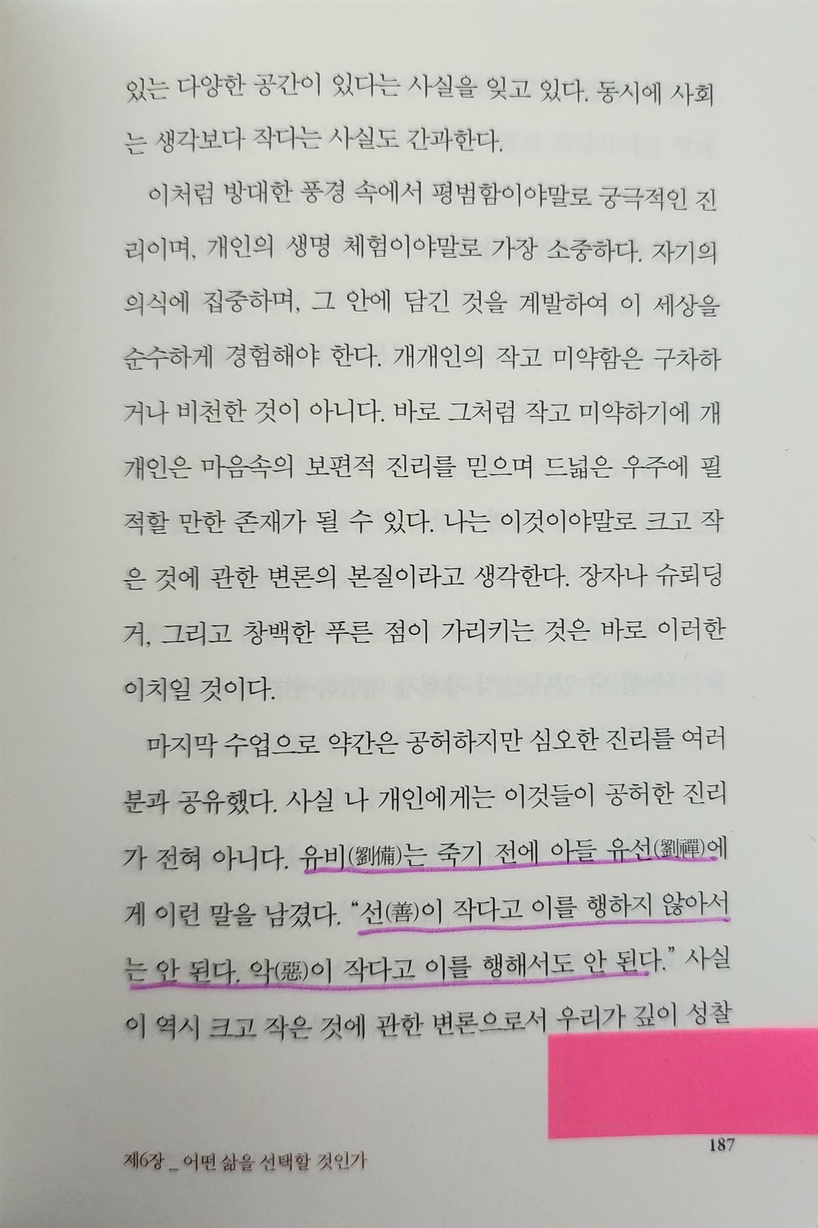 <유비는 죽기 전에 아들 유선에게 이런 말을 남겼다. "선이 작다고 이를 행하지 않아서는 안 된다. 악이 작다고 이를 행해서는 안 된다." 책 187쪽>
